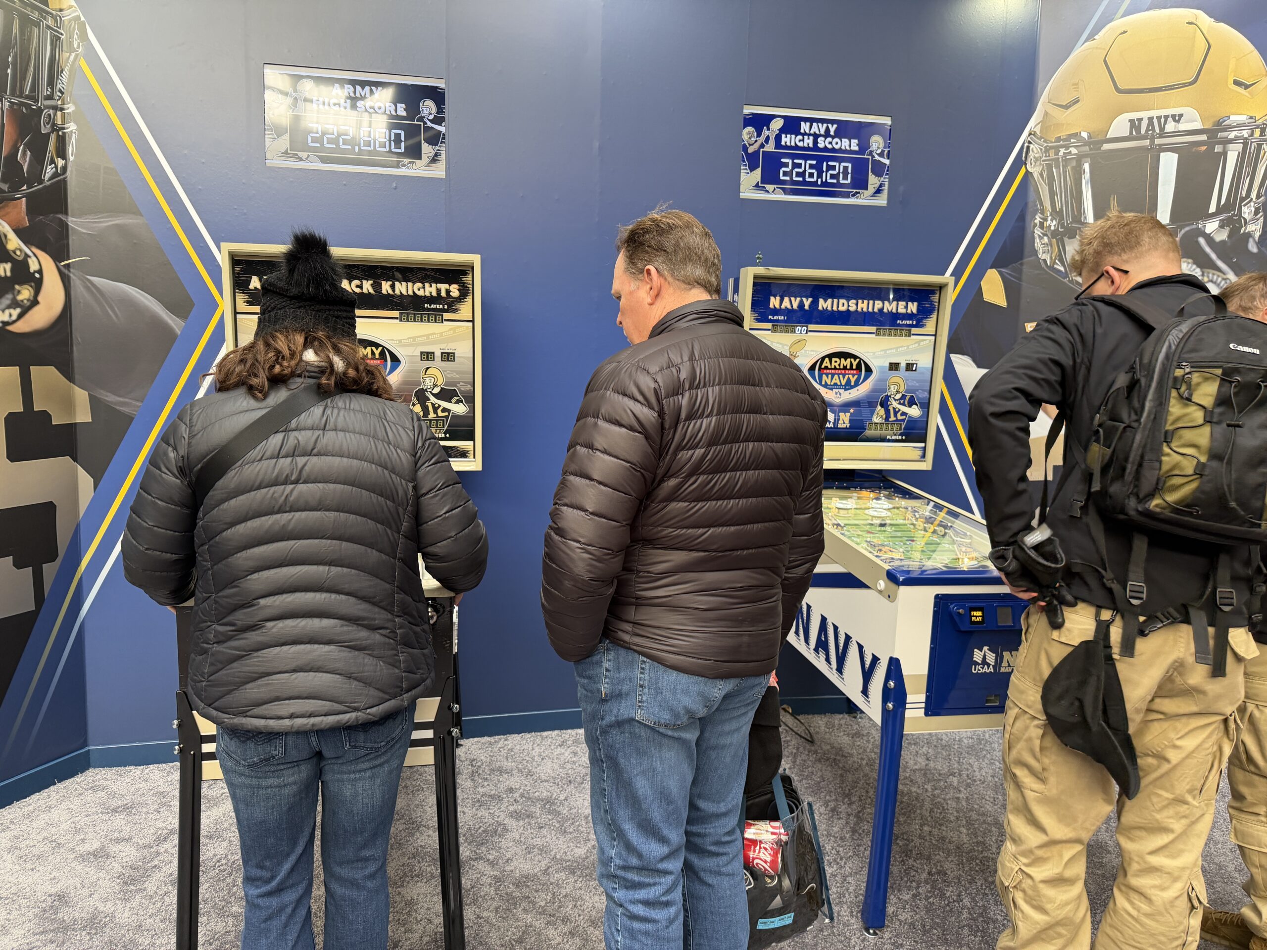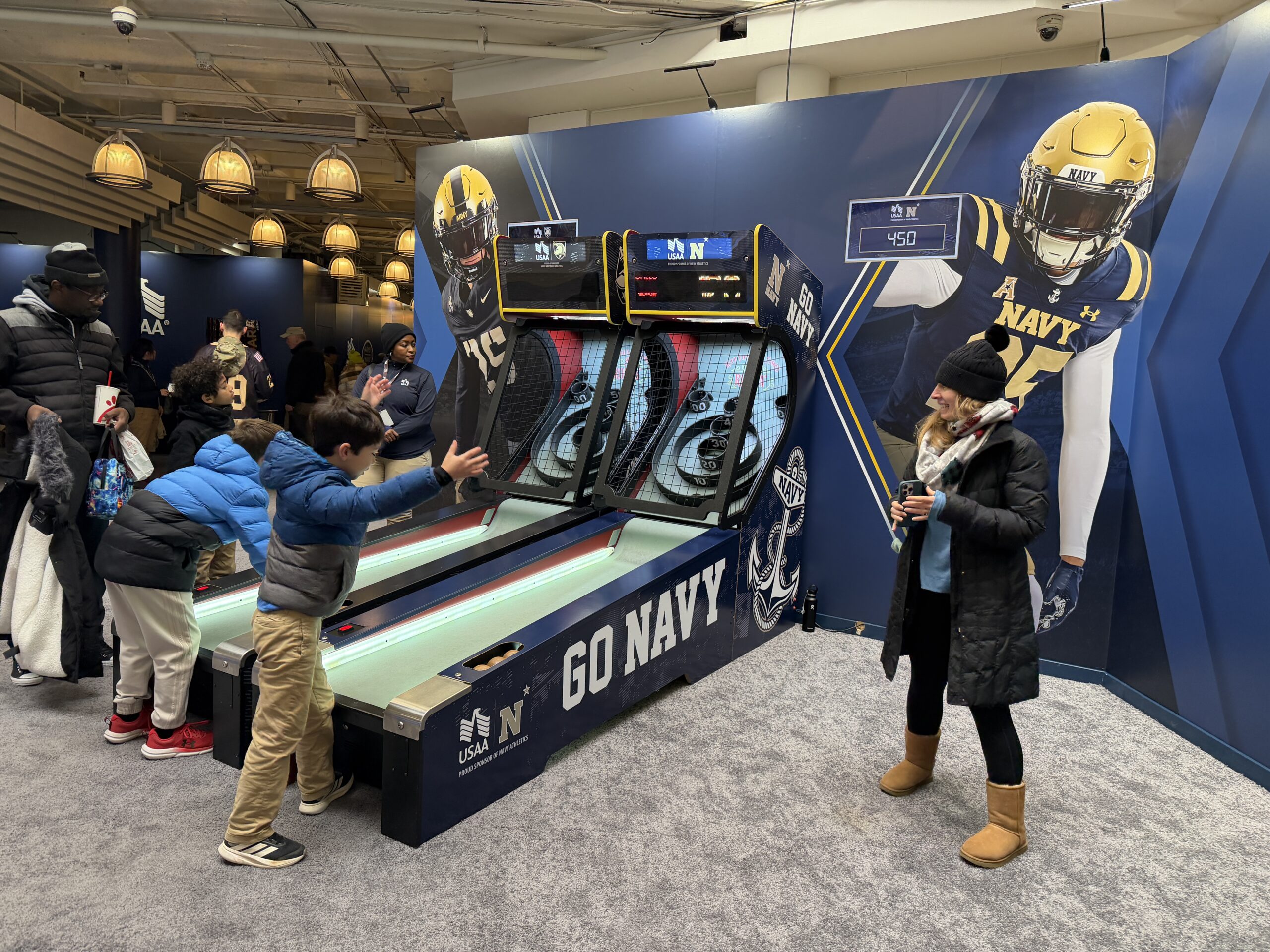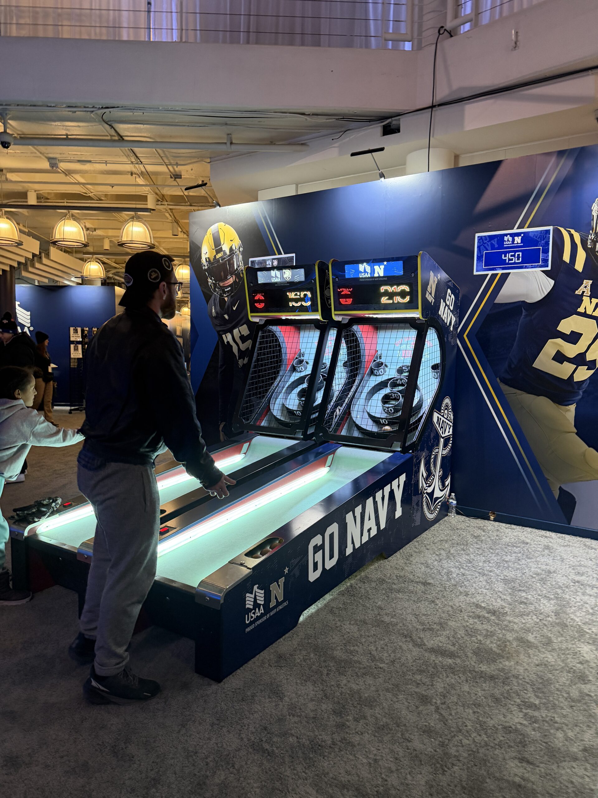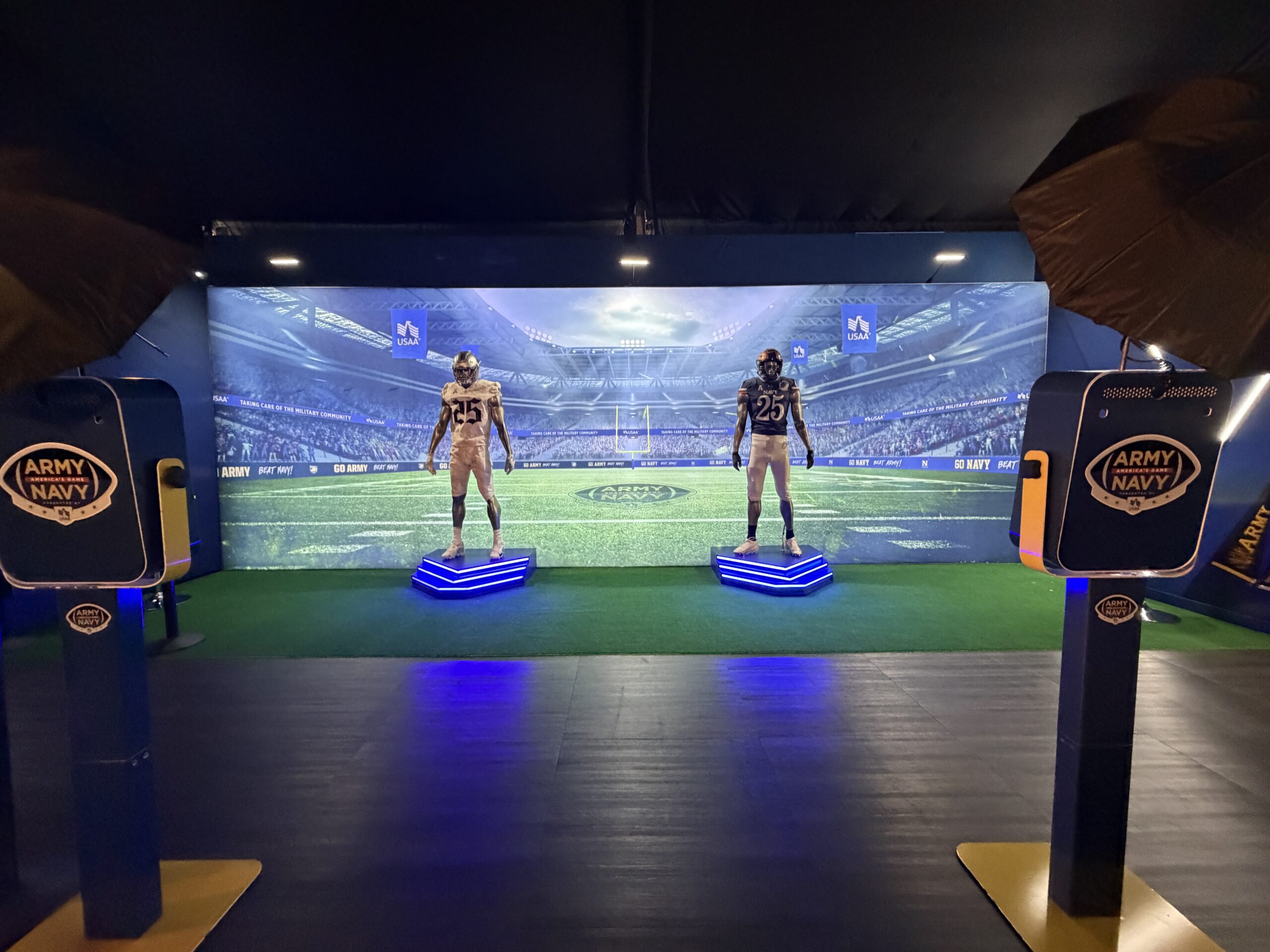 In the Main fan zone, engagement shifted toward participation and team pride. A cheer button experience invited fans to press their team’s button — Army or Navy — with every press counted to determine which side showed up strongest. This area also featured photo kiosks and additional internet-supported experiences.